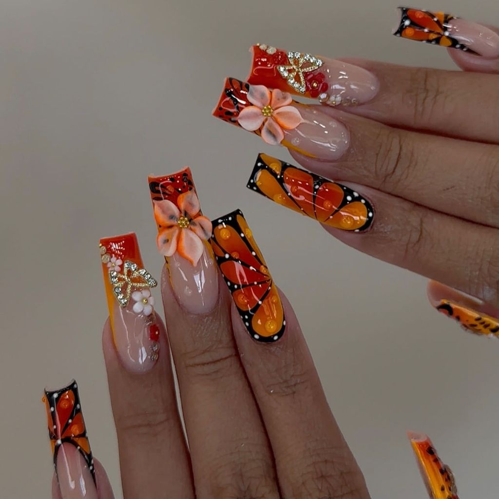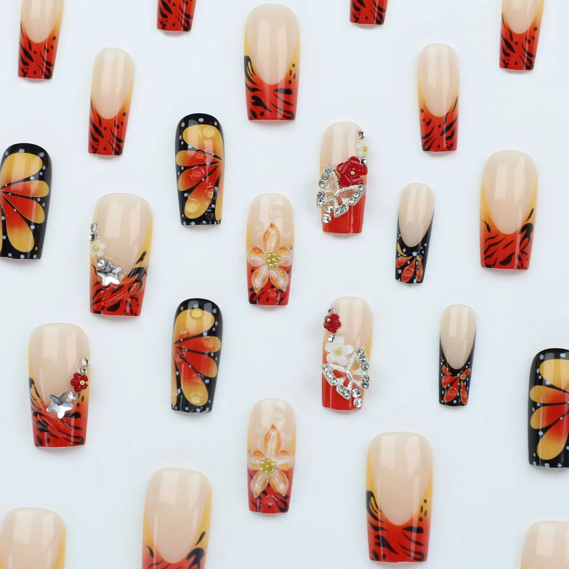 Yellow Flower ABS Artificial Nails Orange Butterfly Design